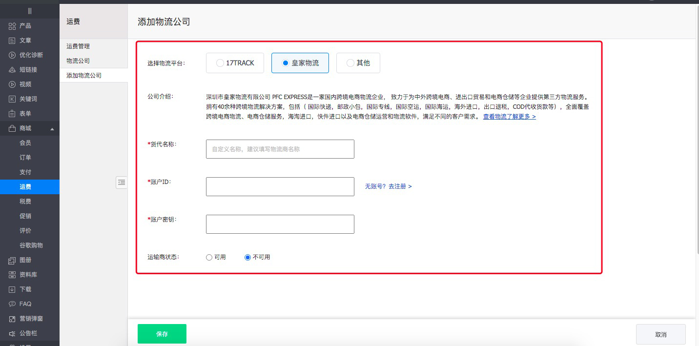 2、商城套餐下的“运费管理”模块下,新增“皇家物流”的对接,帮助卖家实现一键发货的需求,减少商城运营成本;
