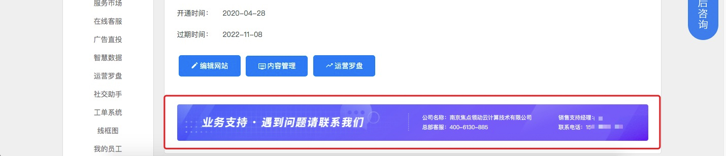 3、网站列表增加“业务支持”联系方式,方便大家需要业务支持时随时可以联系到业务支持经理;