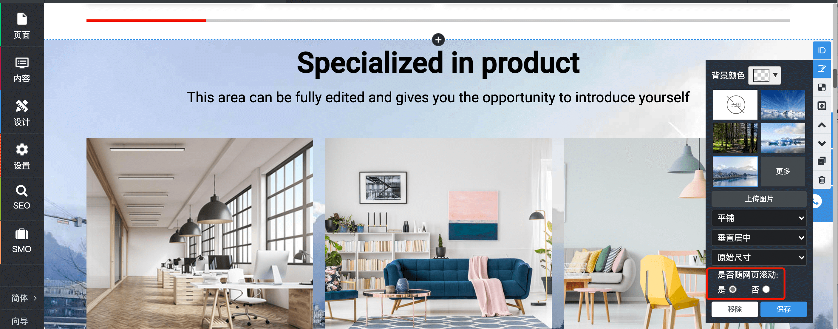 4、区块的背景设置上新增背景视差功能;